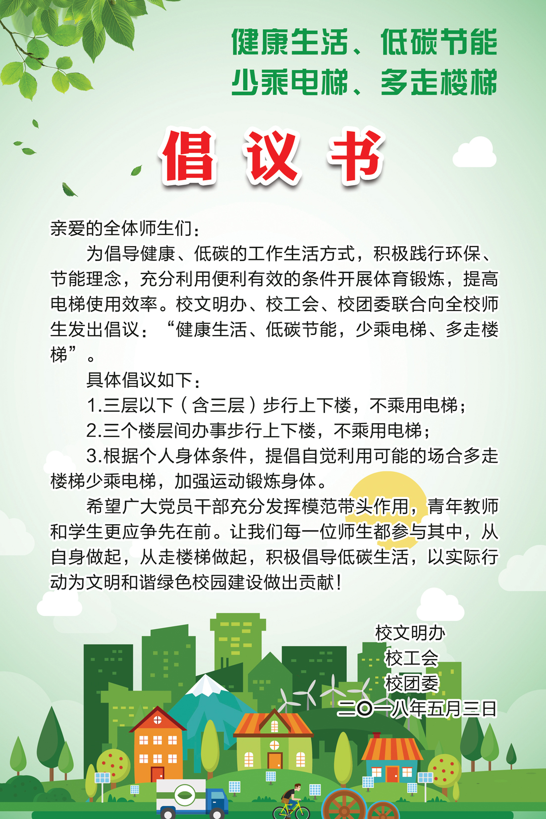 “健康生活、低碳节能,少乘电梯、多走楼梯”倡议书