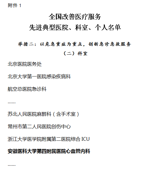 2月2日,国家卫生健康委办公厅发布《关于通报表扬2018-2020年改善医疗服务先进典型的通知》,对在改善医疗服务的5项工作制度和10项创新举措等15个方面中涌现出的先进典型进行通报表扬。安医大四附院心血管内科在“危急重症为重点,创新急诊急救服务”方面开展的创新举措获通报表扬,荣获“全国改善医疗服务先进典型科室”。
