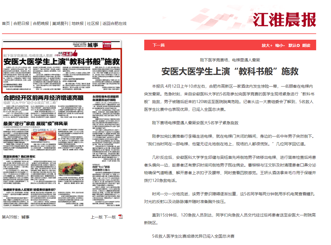 江淮晨报、合肥晚报:安医大医学生上演“教科书般”施救