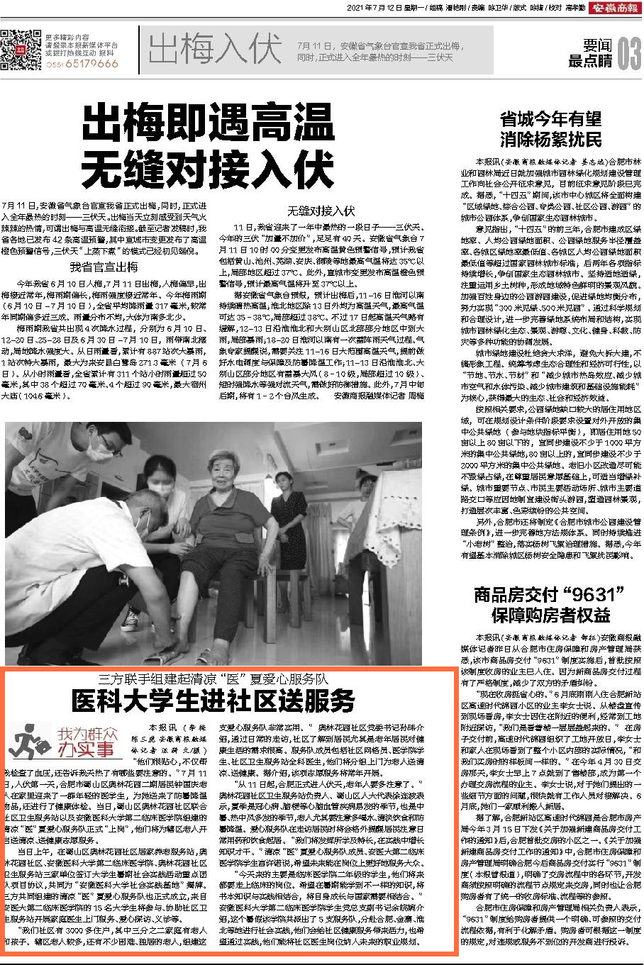 “从11日起,合肥正式进入伏天,老年人要多注意了。”奥林花园社区卫生服务站负责人、蜀山区人大代表徐连波表示,夏季是冠心病、脑梗等心脑血管疾病易发的季节,也是中暑、热中风多发的季节,老人尤其要注意多喝水、清淡饮食和防暑降温。爱心服务队在走访居民时将会格外提醒居民注意日常用药和饮食起居。“我们将发挥所学及特长,在实践中增长知识才干。”清凉“医”夏爱心服务队成员、安医大第二临床医学院学生宫许诺说,希望未来能在岗位上更好地服务大众。