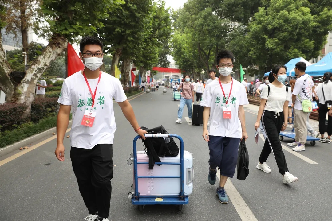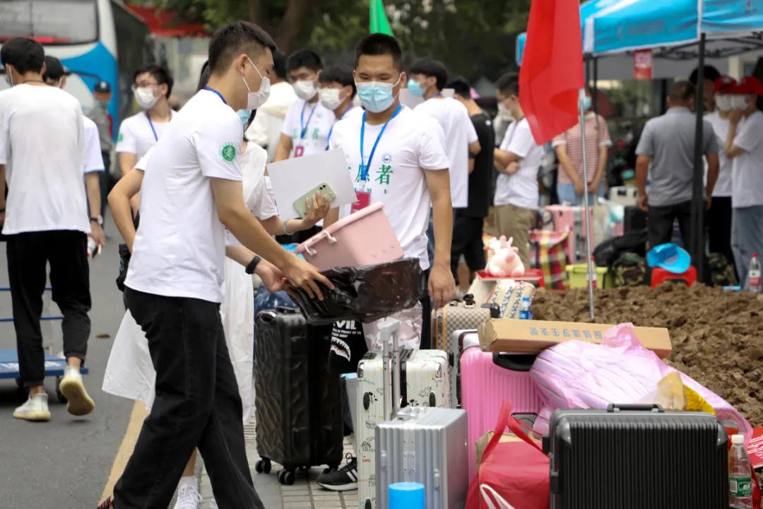 “同学,请扫码、测温后进入。”“同学,你好!请进行手部消毒。”“同学,你好!请更换口罩。”“同学,你好,我帮你拿行李。”“同学,你好!你是哪个学院的?我帮你把行李带去报到地点。”到达学校,身穿统一服装、佩戴红色胸牌的志愿者们则在北门、图书馆门口、青年志愿者岗亭等校园各个服务点,热心地为新生提供托运行李、报到指导、问题解答等全流程服务。他们分工明确、各司其职,面面俱到的服务留下无数温暖瞬间,令新生啧啧称赞。