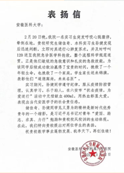 “两位大学生敏锐的急救意识和扎实的急救技能,教科书般地展现了医学生的专业素养,为我们后续成功救治赢得了宝贵时间,挽救了一个年轻的生命,也挽救了一个家庭。”事后,刘正东忍不住点赞。