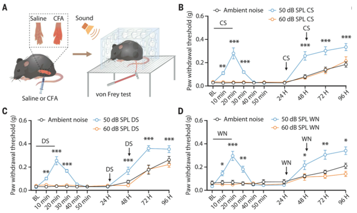 相对于环境噪声的低强度声音在小鼠中引起镇痛(图源自Science )