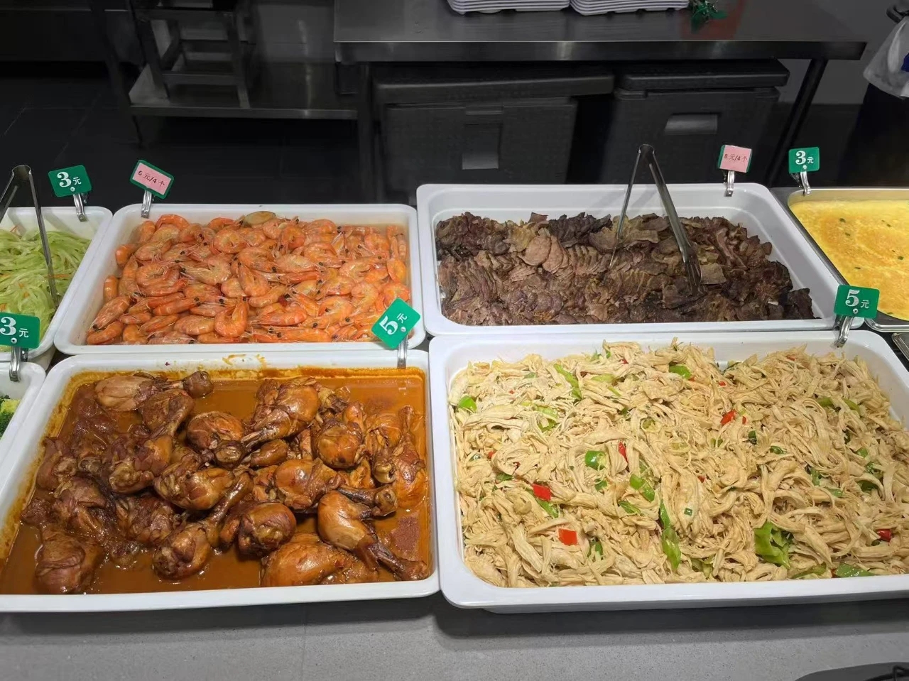 该窗口的自助区菜品丰富多样,且实行一菜一价的定价模式。其中,卤鸡腿每个5元,拌鸡丝每份5元,蒜泥西兰花每份4.5元,白煮鸡蛋每个1元,芹菜炒木耳每份3元,糙米饭每碗1元……不少同学会选择一个荤菜搭配两个素菜,再配上一碗糙米饭,这样一顿下来,花费基本在15元以内。